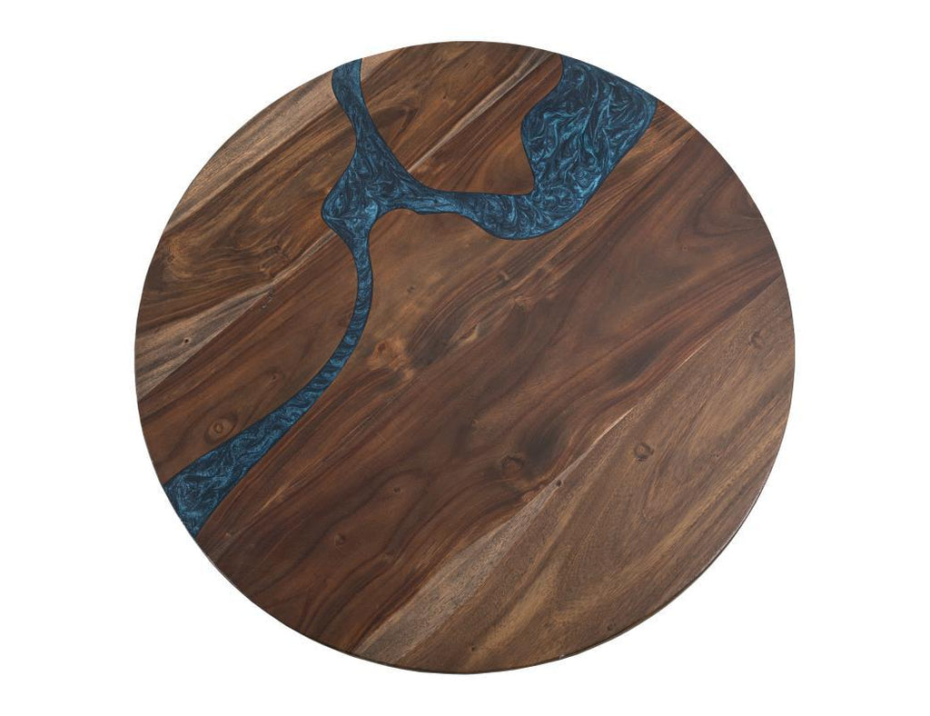 Bring refined artistry into your home with the Zaphiro River Table, a stunning blend of natural elegance and bold design. Handcrafted from parota and sustainable mango wood. Flowing through the center is a gemstone-inspired river inlay, created with epoxy resin infused with shimmering blue flakes that capture the depth and brilliance of sapphire. This luminous detail adds movement and visual intrigue, transforming the tabletop into a true work of functional art. The rich grain and tonal variation of parota wood are thoughtfully highlighted, offering warmth and texture that complement a range of interiors. The pedestal base, with its geometric design, is crafted from sturdy wood, providing a stable, long-lasting foundation and making it ideal for everyday use. Built with IFD’s commitment to quality, sustainability, and timeless design, the Zaphiro Round Table offers exceptional character, craftsmanship, and functionality for today’s home.