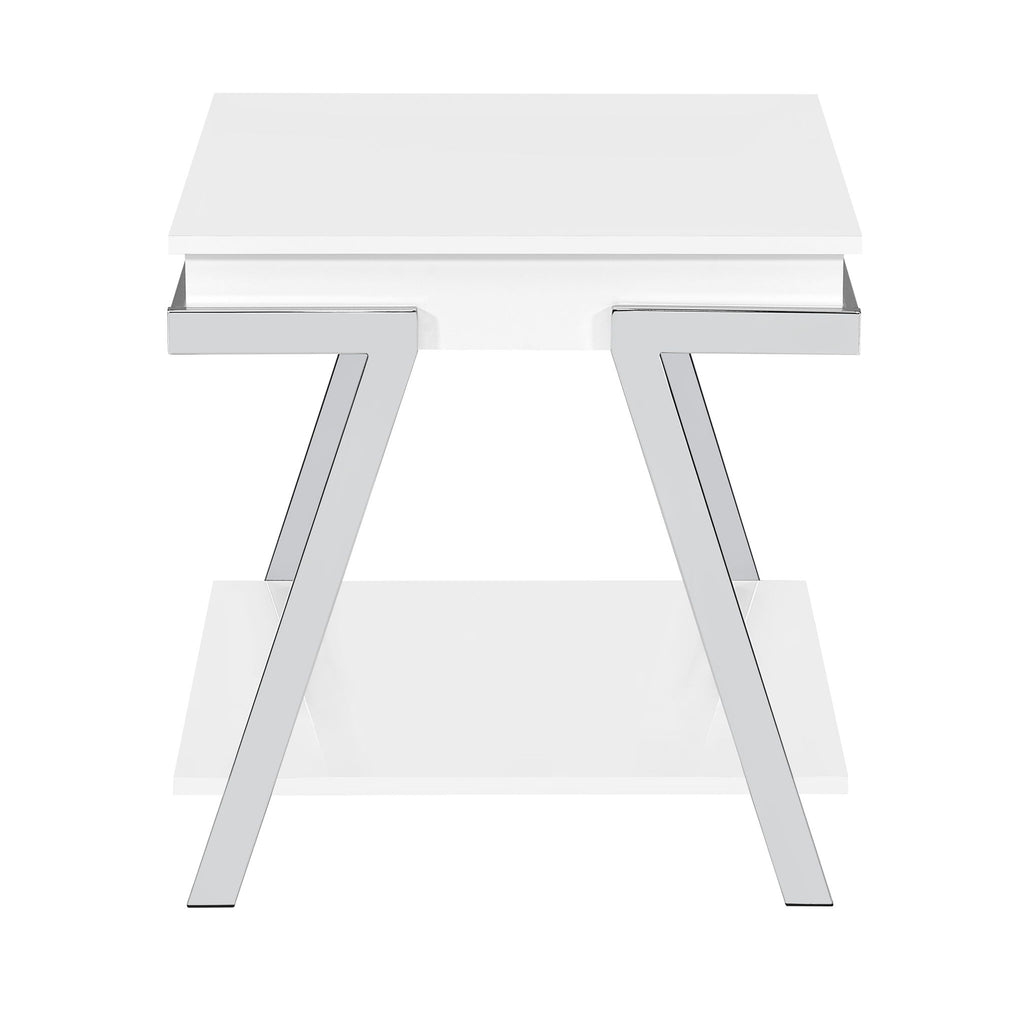 Midcentury modern design meets glam styling in the Zena End Table. Canted chrome legs frame the white finished wood center in a neutral but not boring complement to any decor. The perfect side table companion to your favorite chair, this versatile table also can be used between upholstery or as a glam nightstand. Modern and sophisticated, Zena is a great accent for any room.