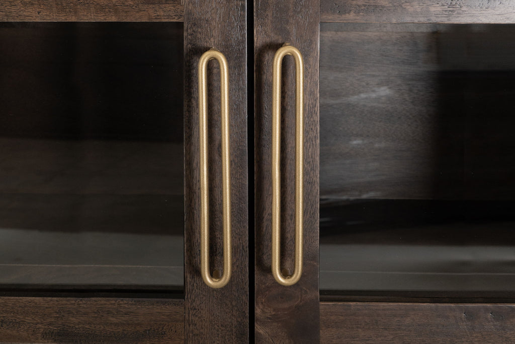 2 Drawer & 2 Glass Doors, Cabinet. This beautifully crafted cabinet, part of the Balam Collection, is both stylish and functional. It features two glass-paneled doors that provide a clear view of the interior, making it perfect for showcasing your cherished items. Below the doors, two spacious drawers offer extra storage. The cabinet's design combines modern elegance with practicality, making it a versatile addition to any room.