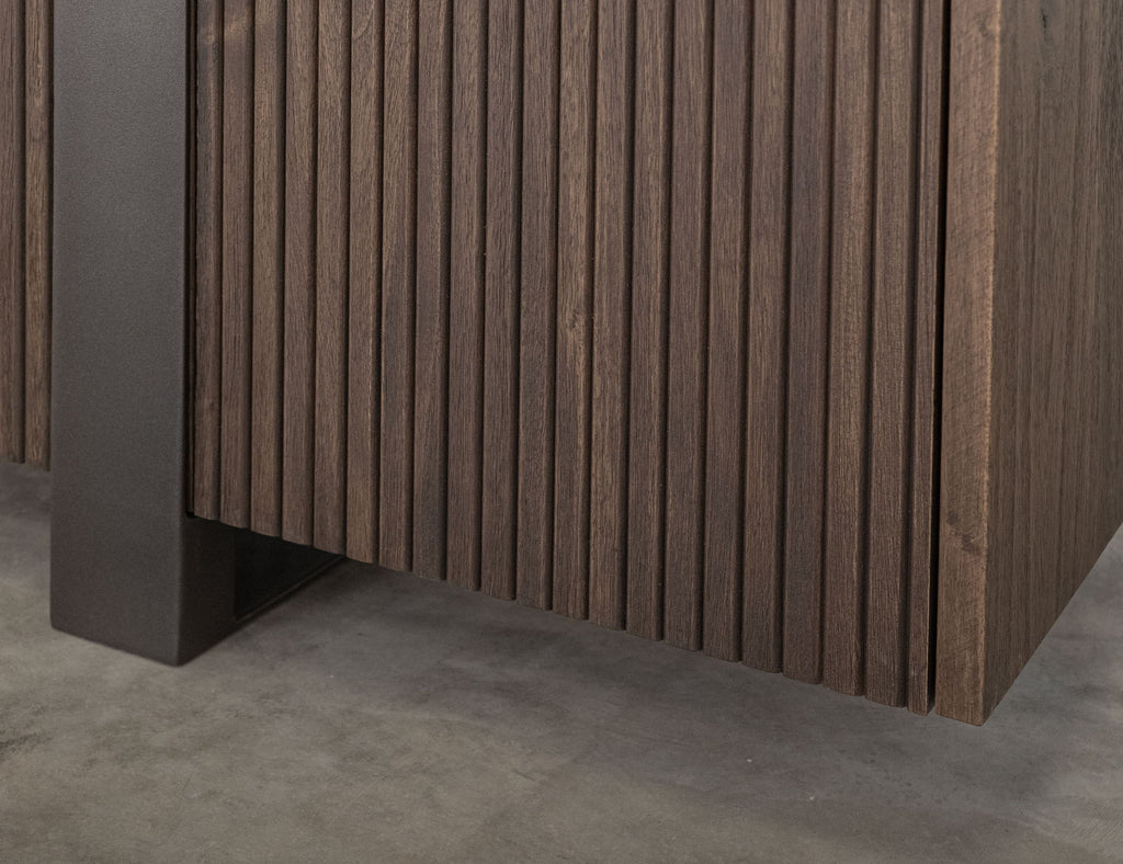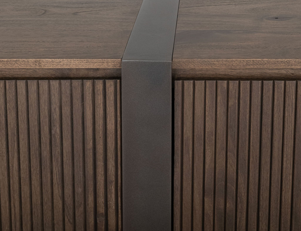 4 Door, Console. The captivating Haab console boasts beautifully channel detailing doors and integrated metal accents with a hidden pull system. The soft, inviting texture of the natural wood grain offers an engaging sensory experience, encouraging you to run your hands along its surface.