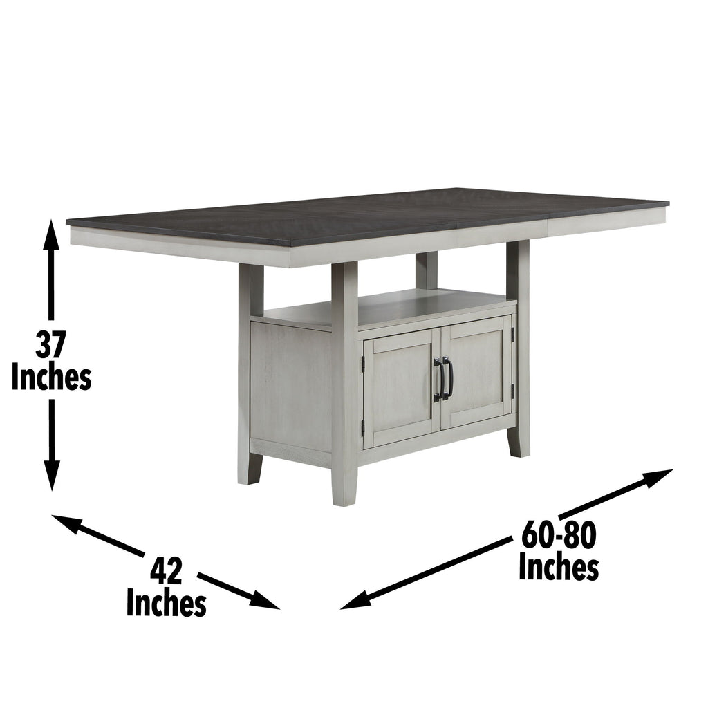 Relaxed, transitional styling in a neutral two-tone milk and finish are the hallmarks of the comfortable Hyland Counter Dining Set. A Storage Counter Table anchors any dining area ably with a 20-inch insertable leaf to expand to 80-inches for seating of up to eight. The finish marries up with the oil-rubbed nickel hardware and vegan rawhide upholstered chair to create a fresh yet approachable dining set you will treasure for years.
