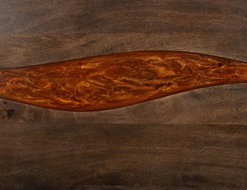 Inspired by the strength and spirit of the Rarámuri people, this bedroom collection celebrates raw beauty and refined craftsmanship. Each piece pays tribute to nature’s resilience, featuring deep, moody wood tones accented with striking epoxy fills that flow like rivers through rugged terrain. The result is a bold yet sophisticated aesthetic that appeals to those who value authenticity and artistry. The Rarámuri bed stands as a commanding centerpiece with a sculptural headboard, seamless epoxy inlays, and a tactile finish that invites touch and admiration.