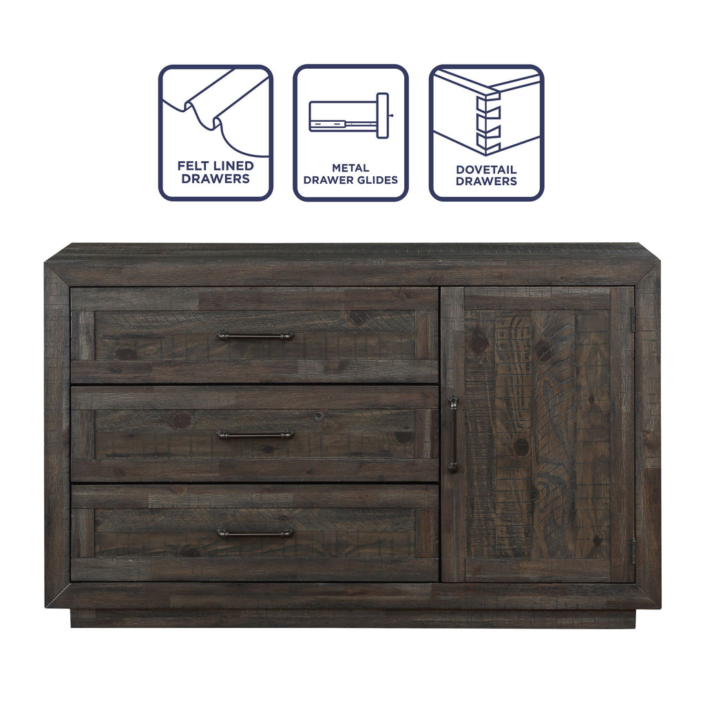 The Riverdale Black Server, with its rich distressed pine and subtle black finish, whispers tales of rustic elegance. Three deep drawers and a secretive door hint at memories yet to be made, while effortlessly cradling dining essentials. It's not merely storage but a dance of history and future, embodying the beauty and simplicity woven within deep narratives. In the ballet of casual dining, it stands as a poignant principal, quietly commanding attention.