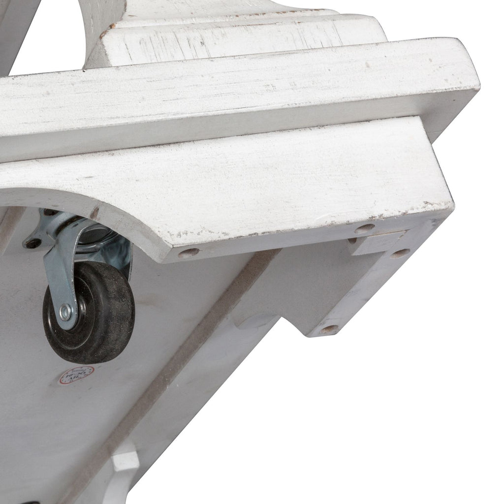 Elevate your space with the Spanish style Sedona cocktail table. Crafted of rubberwood solids and white oak veneers, this piece features a heavy distressed white finish and gravel top, appealing planked top with square peg accents, a planked bottom shelf for additional storage, casters for easy mobility, and is anchored by Spanish style square turned legs. Also available in an alternate finish, this gorgeous cocktail table will be a great addition to any traditional style space.